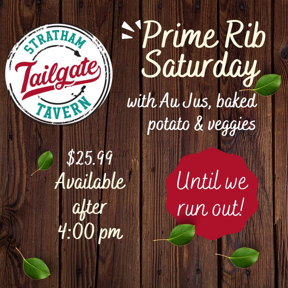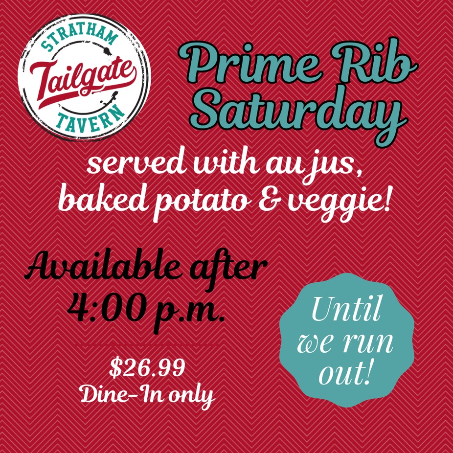 Starting at 4:00 pm, we're serving up a generously sized, juicy prime rib, served with au jus, baked potato and chef's vegetable of the day. Available until we run out!