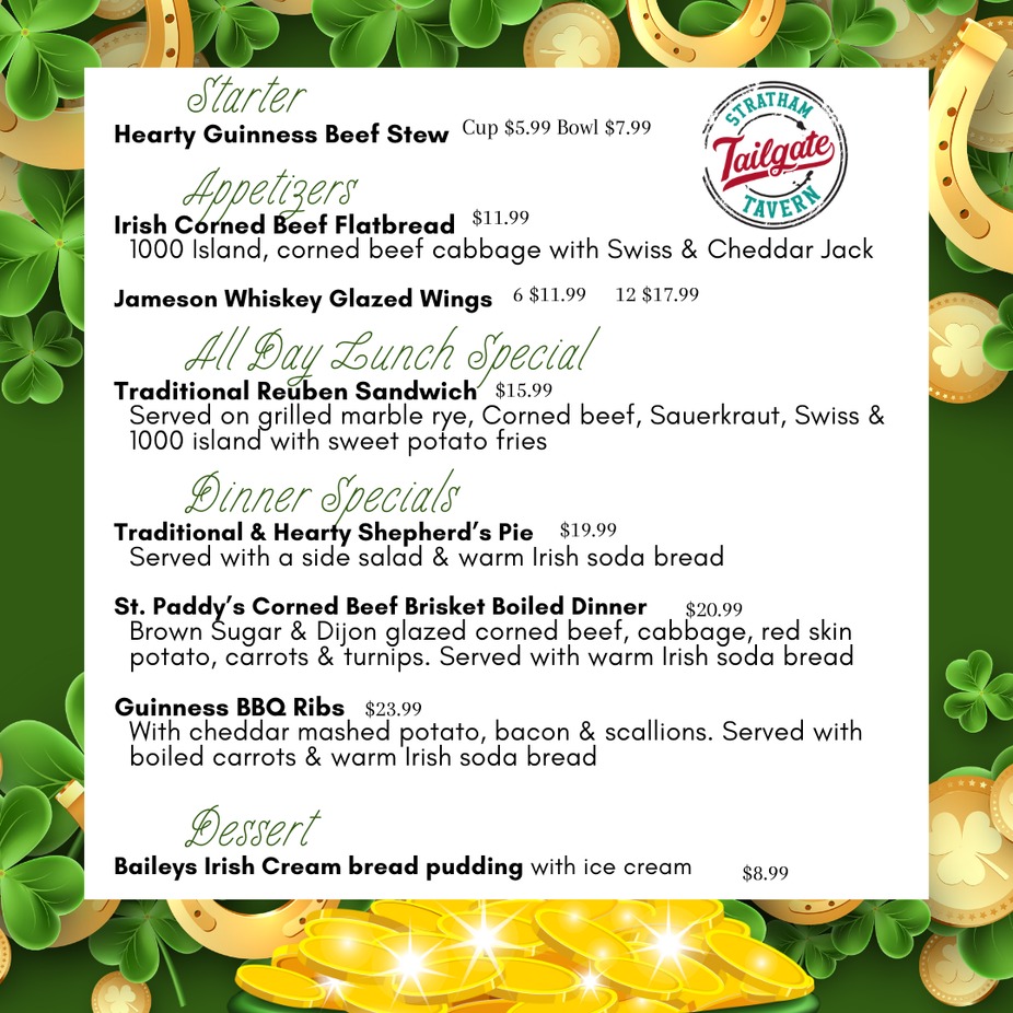 Join us on St. Patrick's Day for our annual Hooley (we had to google that)😂 Check out Chef's famous Irish Biachlár (google that too!)